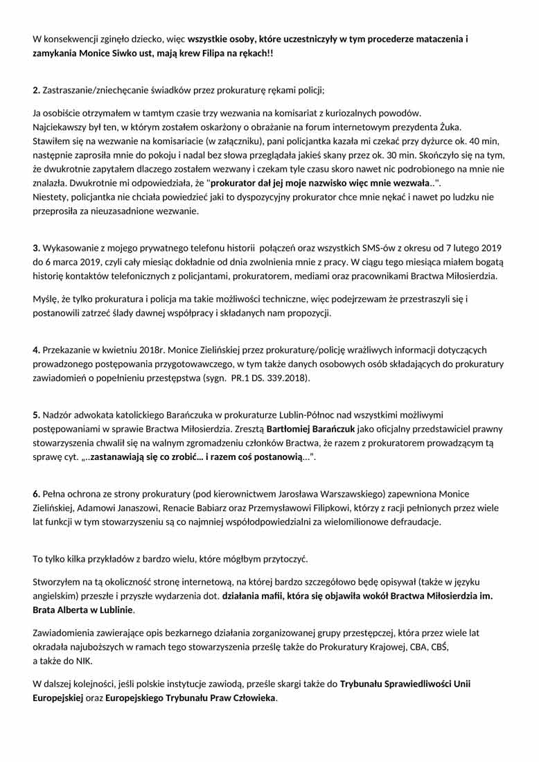 Wtedy już wiedziałem, że jest to kolejne celowe działanie lubelskiej prokuratury nakierowane na bezprawne utrudnienie moich działań i maksymalne zniechęcenie mnie do dalszej walki o prawdę z ich kolegą z pracy Piotrem Michalakiem.