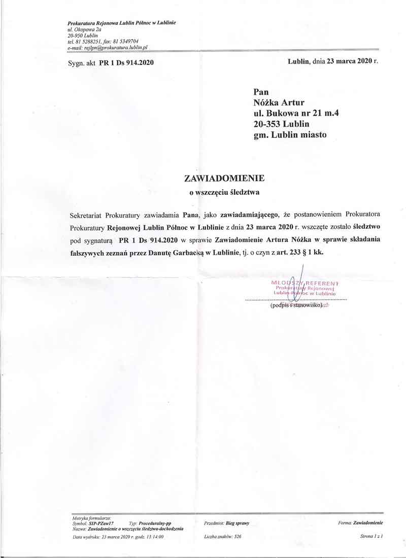 23 marzec 2020 – Co ciekawe tylko w stosunku do Danuty Garbackiej zostało wszczęte śledztwo.