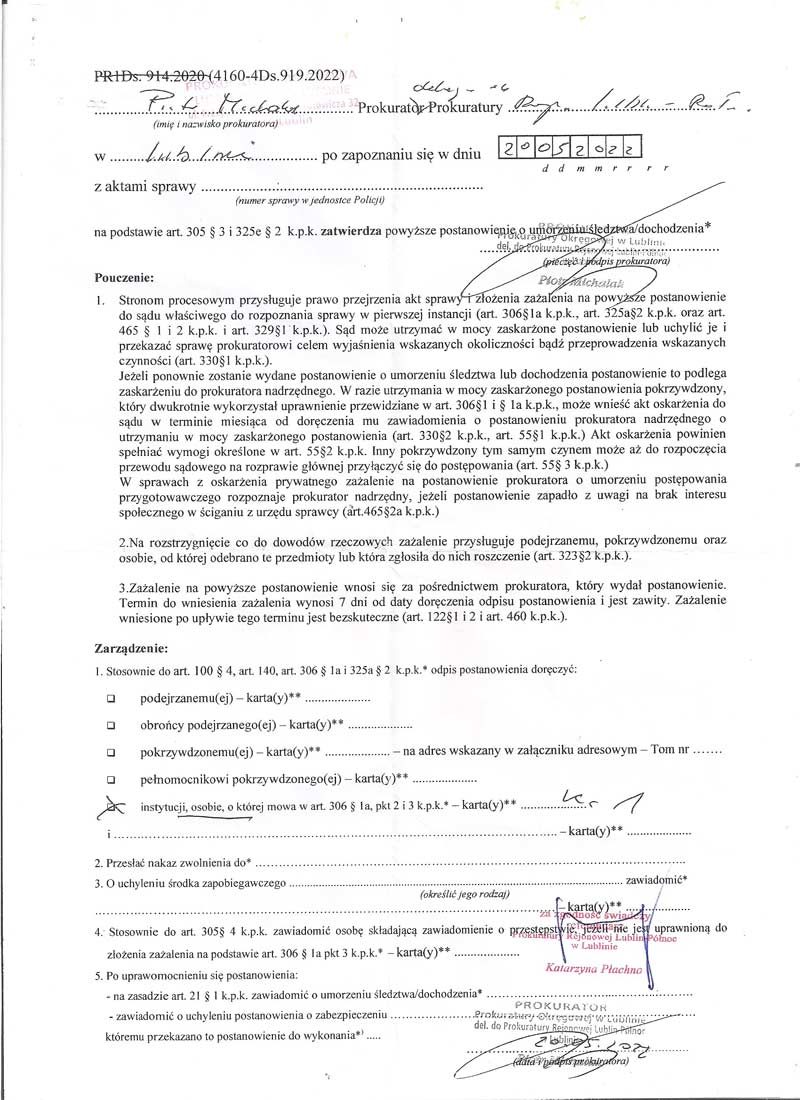 luty 2022 – Departament Postępowania Sądowego Prokuratury Krajowej skierował do Prokuratury Okręgowej w Lublinie pismo obligujące do zweryfikowania działań m.in. w przedmiotowej sprawie.